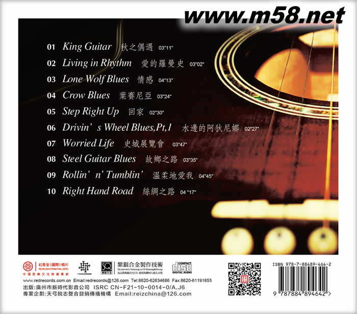 01 King Guitar 秋之偶遇 03"11" 02 Living in Rhythm 愛的羅曼史 03"02" 03 Lone Wolf Blues 情感 04"13" 04 Crow Blues 葉賽尼亞 03"24" 05 Step Right Up 回家 02"30" 06 Drivin’s Wheel Blues,Pt,1 水邊的阿狄尼娜 02"27" 07 Worried Life 史城展覽會 03"47" 08 Steel Guitar Blues 故鄉之路 03"35" 09 Rollin’n’ Tumblin’ 溫柔地愛我 04"45" 10 Right Hand Road 絲綢之路 04 "17"