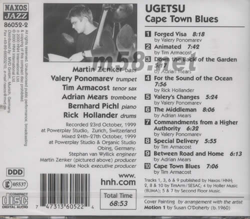 價格為估,以實到貨為準! NAXOS JAZZ UGETSU CAPE TOWN BLUES(m58.net) MADE IN GERMANY BASS /MARTION ZENKER TRUMPET/ VALERY PONOMAREY TENOR SAX/ TIM ARMACOST TROMBONE/ ADRIAN MEARS PIANO BERNHARD PICHI DRUMS RICK HOLLANDER