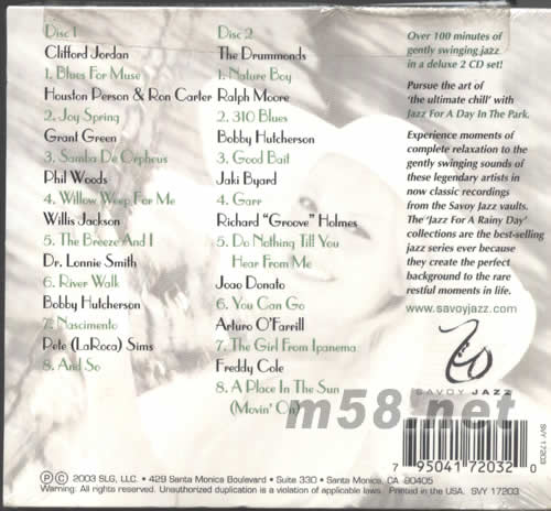 價格為估,以實到貨為準! JAZZ FOR A DAY IN THE PARK消閑爵士極品(m58.net) 美國天龍旗下SAVOY JAZZ本年度最令人驚喜的變CD 精選專輯,輯錄多首名師演繹作品。聆聽令人心情愉快的爵士樂經典,完全散發出假日情懷,美國原裝進口,重新混音推出,音色通透絕倫,特價發售
