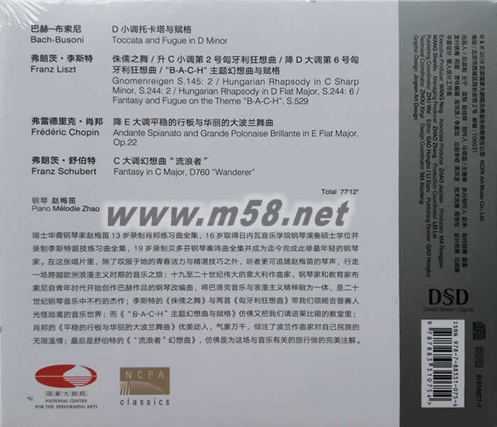 舒伯特 流浪幻想曲 DSD(國家大劇院系列)(m58.net) 張專輯是鋼琴家趙梅笛演奏舒伯特、李斯特、肖邦的鋼琴作品和布索尼改編巴赫的作品。 趙梅笛的青春活力與精湛技巧讓人嘆服,聽者可追隨她的琴聲,行走一場跨越歐洲浪漫主義時期的音樂之旅:十九至二十世紀偉大的意大利作曲家、鋼琴家和教育家布索尼自青年時代開始創作巴赫作品的鋼琴改編曲,將巴洛克音樂與浪漫主義精神融為一體,是二十世紀鋼琴音樂中不朽的杰作;李斯特的《侏儒之舞》與兩首《匈牙利狂想曲》帶我們領略吉普賽人光怪陸離的音樂世界;而《“B-A-C-H”主題幻想曲與賦格》仿佛又把我們請進萊比錫的教堂里;肖邦的《平穩的行板與華麗的大波蘭舞曲》優美動人、氣象萬千,傾注了波蘭作曲家對自己民族的無限溫情;最后是舒伯特的《“流浪者”幻想曲》,仿佛是為這場與音樂有關的旅行做的完美注解。