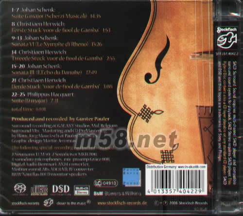 1-7 .Johan Schenk: Suite G major (Scherzi Musicali) 8 . Christiaen Herwich: Eerste Stuck “voor de fiool de Gamba 9-13 . Johan Schenk: Sonata VI (Le Nymphe di Rheno) 14 . Christiaen Herwich: Tweede Stuck “voor de fiool de Gamba 15- 20. Johan Schenk: Sonata III (L’Echo du Danube) 21. Christiaen Herwich: Derde Stuck “voor de fiool de Gamba" 22-25. Philippus Hacquart: Suite (D major)