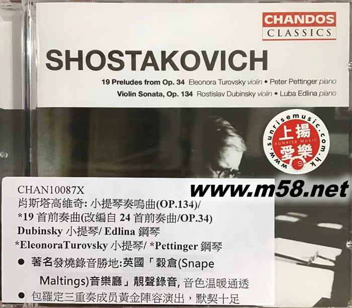 肖斯塔高維奇 小提琴奏鳴曲 Shostakovich: works for violin & piano, and arrangements of Piano Preludes(m58.net) Rostislav Dubinsky,小提琴/ Luba Edlina, 鋼琴/ Eleonora Turovsky, 小提琴/ Peter Pettinger, 鋼琴 肖斯塔高維奇: 小提琴奏嗚曲(OP.134)/ *19首前奏曲(改編自24首前奏曲/OP.34) 發燒古典錄音大師威金森(K. Wilkinson) 至愛錄音勝地:英國「穀倉(Snape Maltings)音樂廳」靚聲錄音 包羅定三重奏成員黃金陣容演出,默契十足