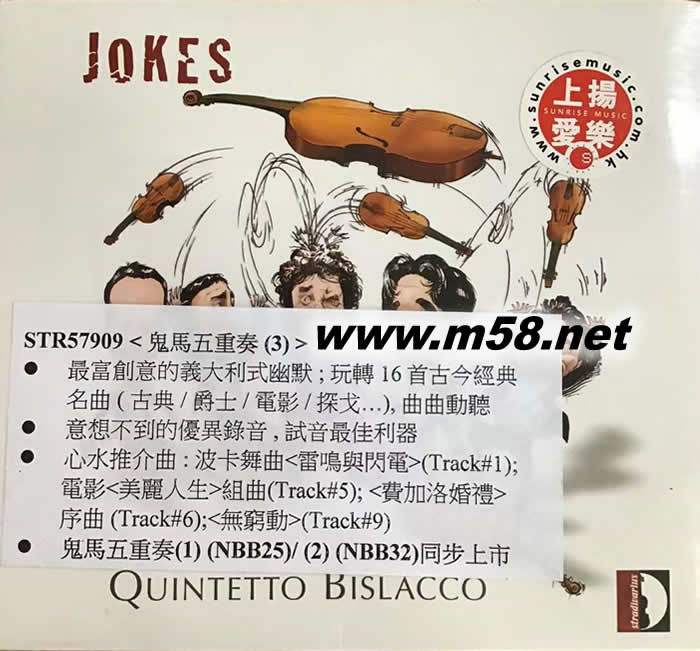 Jokes 鬼馬五重奏 (3)(m58.net) 最富創意的義大利式幽默 ; 玩轉16首古今經典名曲 ( 古典 / 爵士 / 電影 / 探戈…), 曲曲動聽 意想不到的優異錄音 , 試音最佳利器 心水推介曲 : 波卡舞曲<雷鳴與閃電>(Track#1); 電影<美麗人生>組曲(Track#5); <費加洛婚禮>序曲 (Track#6);<無窮動>(Track#9) 義大利原裝進,NBB25鬼馬五重奏(1)同步上市