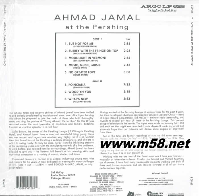 爵士三重奏AHMAD JAMAL TRIO AT THE PERSHING BUT NOT FOR ME(鋼琴、吉它、貝斯) 黑膠(m58.net) AHMAD JAMAL出生:1930年匹茲堡。50年代開始進(jìn)入爵士樂壇,他是很有特色的鋼琴手。1940年代時(shí)他加入George Hudson的大樂隊(duì).1951年組織三重奏,團(tuán)員有吉他手Ray Crawford以及貝斯手Eddie Calhoun。1958年的專輯Ahmad Jamal at the Pershing,是很精彩的,其中有名曲 "Poinciana"至今仍很受歡迎。