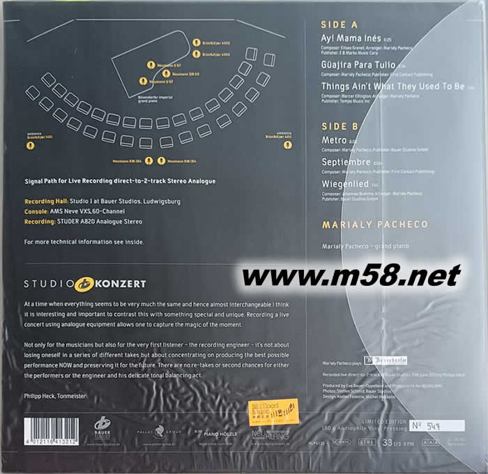 純模擬黑膠盤系列:瑪莉亞妮.栢齊歌 Studio Koncert (AAA Series): Marialy Pacheco 黑膠 限量版(m58.net) 古巴爵士女鋼琴家瑪莉亞妮在博耳錄音室的音樂會現(xiàn)場實況專輯,她將拉丁爵士樂的架構(gòu)重新改變,效果新穎。這是一張高質(zhì)素的唱片特別是對喜愛鋼琴獨奏爵士樂樂迷的不二之選?,F(xiàn)場直接入兩軌模擬錄音臺,全球限量發(fā)行1000套編號版。 最接近原音的純模擬製作—Studio Konzert黑膠系列 由現(xiàn)場錄音,直接入兩軌模擬錄音臺(Direct-To-2-Track) 至母盤制作整個過程全是模擬制作(AAA),全球限量發(fā)行1000套編號版 瑪莉亞妮.栢齊歌(Marialy Pacheco)出生於古巴的哈瓦那(Havana),自幼研讀作曲和鋼琴演奏,現(xiàn)居於紐西蘭。她曾與[昆士蘭交響樂團(Queensland Symphony Orchestra)]表演巴克的作品,是首位女性嬴得極具聲望的[蒙特勒鋼琴獨奏比賽(Montreux Solo Piano Competition)]桂冠,評審主席解釋在三位入圍的參賽者中選出冠軍屬誰是很難決定的事情,最終的取捨是基於栢齊歌在音樂上表露的喜悅和感情的投入,使人動容。她亦在2012年的[昆士蘭音樂大獎(Queensland Music Awards)]獲得[爵士樂獎(Jazz Award)]。她的最新專輯是她在德國著名錄音室「博耳(Bauer Studio)」的音樂會現(xiàn)場實況錄音的純模擬黑膠盤,這種製作需要演出者除了要具備高水平的演藝質(zhì)素外,更重要是信心的表現(xiàn),因為演出的整個錄音到製成母盤的整個過程若發(fā)生任何錯誤或意外都不能作任何修改或添加補足,而這些缺陷會全部寄存在生產(chǎn)黑膠唱片的母盤內(nèi),這種錄音方法對藝人有極大的挑戰(zhàn),而栢齊歌勇於接受這嚴(yán)格的挑戰(zhàn),以凸顯其過人的天份與才能。專輯的第一首歌曲[哦!母親伊內(nèi)絲(Ay! Mama Ines)]以悅耳生動的旋律展開,配以拉丁節(jié)奏的拍子,仿似著名美國琴家奇克•柯瑞亞(Chick Corea)在古巴探䢟的舒暢。[今非昔比(Things Ain’t What They Used To Be)]是旋律優(yōu)雅的小調(diào),[地下鐵 (Metro)]是左手演奏急促的和弦開始伴著靈厲的右手奏出美妙的旋律。在這張以琴獨奏音樂為主的唱片,你可聽到栢齊歌是一位成熟優(yōu)雅的樂手,從她的演譯和作曲可感受到她對韻律有深入的了解。另一方面她亦有將拉丁爵士樂的架構(gòu)重新改變,效果新穎。這是一張高質(zhì)素的唱片特別是對喜愛鋼琴獨奏爵士樂樂迷的不二之選。