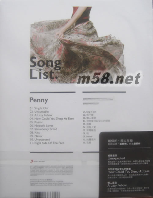 純屬意外(m58.net) 真正的自由里 會(huì)得到最美的創(chuàng)作 戴佩妮獨(dú)立作樂 自創(chuàng)品牌「妮樂佛」創(chuàng)業(yè)作 「純屬意外」 樂手峇里島同步編曲錄音 11首意料之外的小知情歌 她,沒有特定的創(chuàng)作模式,沒有固定的宣傳手法,沒有嘗試不了的樣子,只有不得不記錄的生活態(tài)度,隨興所至,成敗與否,一切「純屬意外」!因?yàn)椋幌胱鲩_心的事! 「純屬意外」整張專輯呈現(xiàn)出不同于一般流行歌曲以歌聲為主、伴奏服務(wù)歌聲的模式,戴佩妮把歌聲也當(dāng)作是樂器之一, 歌聲與樂器演奏都有各自獨(dú)立的生命,因此在聆聽時(shí)可以聽到歌聲、吉他、鍵盤、Bass、鼓不同的細(xì)節(jié)表現(xiàn),整體音樂性非常豐富!在專輯中收錄了11首歌曲,都是Penny在發(fā)行上一張專輯「回家路上」之后的一年多內(nèi)新寫的歌,有多種戴佩妮最擅長(zhǎng)的曲風(fēng),分別闡述生活中種種「純屬意外」的遭遇和心情。 從融合電子、英式搖滾、歌德?lián)u滾、峇里島民俗旋律的「Sing it out」開場(chǎng),就可以聽見戴佩妮大膽玩音樂的企圖心,「純屬意外」嘗試用幸福來感動(dòng)聽者,「剪不斷」、「無賴」、「右臉」則是大家最熟悉的Penny式動(dòng)人情歌。英式搖滾「你怎麼可以安心的睡著」、快節(jié)奏的「Never」展現(xiàn)戴佩妮對(duì)熱力搖滾的掌握功力。輕快吉他「懶人漫游」、融入南洋風(fēng)斑鳩琴的「草莓面包」跳躍的曲風(fēng)當(dāng)中,戴佩妮又變成可愛小女人,甜得讓人喜孜孜。嬉皮爵士曲風(fēng)的「沒有人愛」與適合深夜聆聽寂寞的靈魂藍(lán)調(diào)「吻」,展現(xiàn)出戴佩妮廣闊深厚的音樂底子。