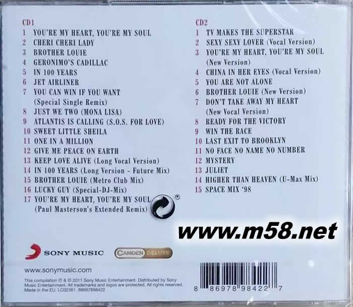 CD 1 1. You're My Heart, You're My Soul 2. Cheri Cheri Lady 3. Brother Louie 4. Geronimo's Cadillac 5. In 100 Years 6. Jet Airliner - Radio Version 7. You Can Win If You Want - Special Single Remix 8. Just We Two (Mona Lisa) 9. Atlantis Is Calling (S.O.S. For Love) 10. Sweet Little Sheila 11. One In A Million 12. Give Me Peace On Earth 13. Keep Love Alive - Long Vocal Version 14. In 100 Years - Long Version - Future Mix 15. Brother Louie - Metro Club Mix 16. Lucky Guy - Special-DJ-Mix 17. Your'e My Heart, Your'e My Soul - Paul Masterson's Extended Remix 收合曲目CD 2 1. TV Makes The Superstar - Radio Edit 2. Sexy Sexy Lover - Vocal Version 3. You're My Heart, You're My Soul - New Version 4. China In Her Eyes - Vocal Version 5. You Are Not Alone 6. Brother Louie - New Version 7. Don't Take Away My Heart - New Vocal Version 8. Ready For The Victory - Radio Version 9. Win The Race 10. Last Exit To Brooklyn 11. No Face No Name No Number 12. Mystery 13. Juliet 14. Higher Than Heaven - U-Max Mix 15. Space Mix '98