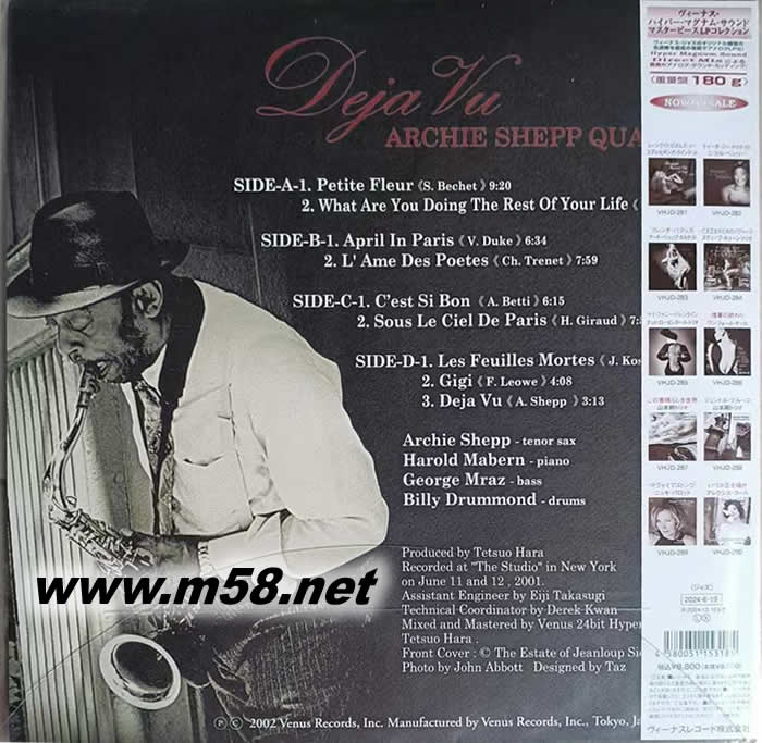 阿奇.西普四重奏:我的愛與愁 Archie Shepp Quartet: Deja Vu 雙黑膠(m58.net) 身兼音樂家、詩人、作家、劇作家多重身份的高音薩克斯風手Archie Shepp,咸認是六十年代最有煽動力的自由樂派樂手。帶有深厚的種族情感和覺醒意識,這位雙子座、曾以音樂藝術為武器,宣揚族人權益的音樂家,似乎永遠不會缺少創造力,只要拿起薩克斯風,他那股奪目耀眼的風采便如泉涌現,這就是為什麼他一出道便驚艷爵士樂界,也能輕易感染他人意識的原因。 今年,Shepp刻意為這張替Venus錄制的最新專輯,以法文取名為“Deja Vu”。曲目全是熟悉的法國香頌,和“April in Paris”、“Sous Le Ciel de Paris”等。音樂除了展現如原曲般對人生有著強烈的感慨外,還帶點濃濃的愛與愁,只是在他性感無比的樂聲下,還是讓人免忘了這份愁!本張專輯榮獲日本專業爵士樂雜志“Swing Journal”金賞獎。 Archie Shepp - tenor sax Harold Mabern - piano George Mraz - bass Billy Drummond - drums