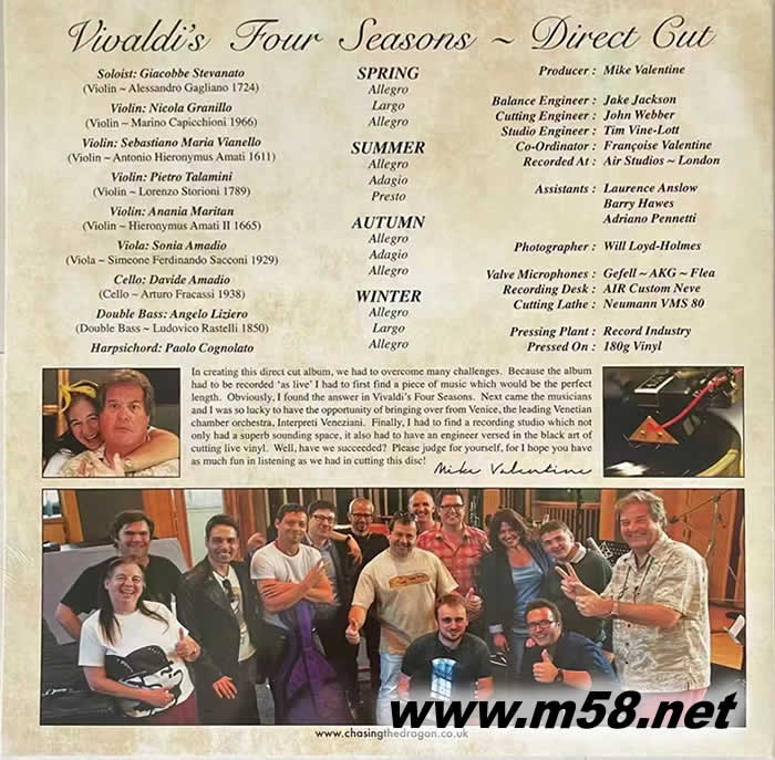維瓦爾第 四季VIVALDI’S FOUR SEASONS 追龍 黑膠(m58.net) nterpreti– Vivaldi’s Four Seasons (180g LP, Direct Cut) (發(fā)燒Mike之直刻四季黑膠) ———— 劉志剛 Interpreti Veneziani Chamber Orchestra Giacobbe Stevanato, violin Nicola Granillo, violin Sebastiano Maria Vianello, violin Pietro Talamini, violin Anania Maritan, violin Sonia Amadio, viola Davide Amadio, cello Angelo Liziero, double bass Paolo Cognolato, harpsichordSelections:。 全團9名成員,演出精神飽滿。收放有度。這是單刀直入、不油膩也不「燃花臣」的好演出。錄音性格也胳合。3D音響臺比較「埋身」(但不過份),動態(tài)寬闊。爆起來(以一支9人組合來說)相當(dāng)刺激。泛音(諧波)結(jié)構(gòu)很完整地展現(xiàn),透明度一流。