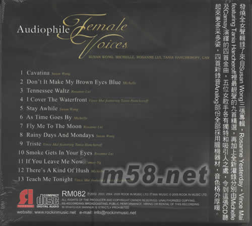 發燒全女聲(m58.net) HIGH RESOLUTION 24BIT/192KHZ DSP 發燒全女發聲 2005女聲發燒天碟第一擊 五位歌手13首超靚聲金曲9首精選+4首全新錄音全新制作 發燒全女聲輯錄了來自SUSAN WONG 三張專輯,ROSANNE YESTERDAY ,VINCE MAIFEATURING TANIA HANCHEROFF里最靚聲的九首精選,再加上全新灌錄分別由MICHELLE 及CAMAY演繹的四首金曲,五位女歌手各有獨特和吸引人之處,令到這張CD聽起來更多采多姿,四首新錄音ANALONG 部分全采用新機器材,音色格外厚暖