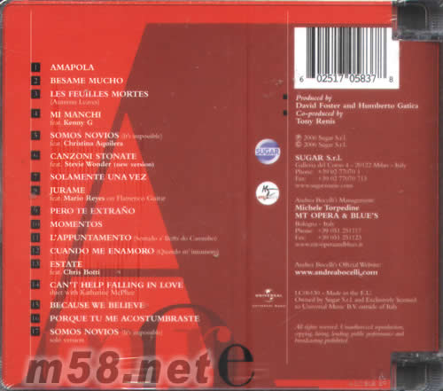 1. Amapola 罌粟花 2. Besame Mucho 無盡的吻 - 戴安娜克瑞兒與「樂士浮生錄」古巴國寶歐瑪拉衷心摯愛的拉丁金曲 3. Les Feuilles Mortes (feat. Veronica Berti) 枯黃的葉 4. Mi Manchi (feat. Kenny G) 我思念你 - 薩克斯風界唯一浪漫天王肯尼吉友情跨刀 5. Somos Novios (duet with Christina Aguilera) 承諾一生 6. Canzoni Stonate (duet with Stevie Wonder) new version 變調戀曲 7. Solamente Una Vez 一次幸福的機會 8. Jurame (feat. Mario Reyes on Flamenco Guitar) 答應我 9. Pero te Extra?o 陌生人 10. Momentos 時時刻刻 11. L’appuntamento 真情相約 12. Cuando Me Enamoro 墜入愛河 13. Estate (feat. Chris Botti) 夏日 14. Can’t Help Falling in Love (Duet with Katharine McPhee) 情不自禁 15. PBecause We Believe 我們相信 16. Porque Tu Me Acostumbraste 為妳鐘情 17. Somos Novios (It’s Impossible) Solo Version 承諾一生