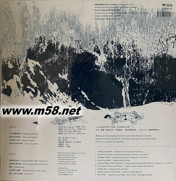 走入有霧的森林 (小提琴、鋼琴、吉他、大提琴)黑膠(m58.net) 小提琴:罡愷 鋼琴:致潔 吉他:謝維 大提琴:桃子 《走入有霧的森林》可以說來自于Cicada的登山日記。我們走入霧霾彌漫的森林,在小溪邊歇息,在北大武山觀賞云海,在奇萊山頂看到了陽光彌漫的草原,沿著山脊線登頂眺望城市,在森林木屋與野生動物嬉戲,還在森林傾盆大雨之后又馬上看見了雪。這些經歷都是是專輯的靈感來源。" ——Cicada