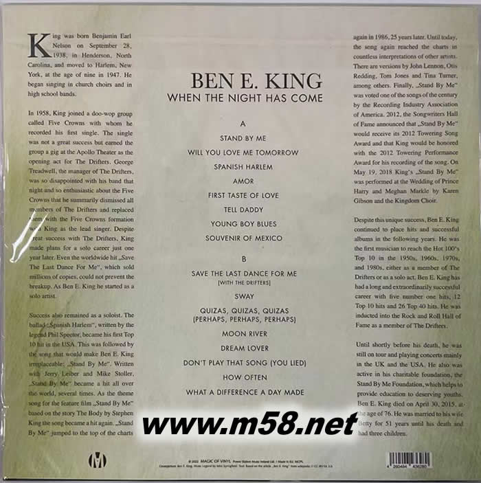 WHEN THE NIGHT HAS COME 班 伊 金 夜幕降臨之時 綠膠 彩膠 黑膠(m58.net) 班.伊.金:夜幕降臨之時 Ben E King · When the Night Has Come (LP) 本杰明·伯爵·納爾遜是流浪者The Drifters.中的一員。盡管取得了巨大的成功,但金還是計劃單打獨斗。即使是全球銷量百萬的熱門歌曲《為我挽救最后一支舞》也無法阻止兩人的分手。作為本·E·金,他開始是一個獨奏藝術家。傳奇人物菲爾·斯派特創作的民謠《西班牙黑人區》第一次打入美國排行榜前十名。緊接著是一首使本·E·金永垂不朽的歌:“站在我這邊。”這首歌曾多次登上排行榜榜首,包括在史蒂文·金的同名電影的推動下,在首次發行25年后再次登上榜首。此外,世界上無數的明星都錄制過《站在我這邊》的版本。盡管如此獨特的成功,本E.金繼續放置更多的點擊和成功的專輯在接下來的幾年。他是第一個在20世紀50年代、60年代、70年代和80年代躋身Bill-board Hot 100前十名的音樂家,無論是作為“漂流者”樂隊的成員,還是作為獨唱演員。本·E·金擁有一個漫長而非凡的成功職業生涯,他有5首第一名,12首前十名,26首前40名。他被任命為搖滾樂名人堂的一員的漂泊者。