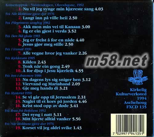 1 Nu Vil Jeg Synge Min Kjareste Sang 2 Langt Inn Pa Ville Heii 3 Akk Mon Min Vei Til Kanaan 4 Eg Er Ein Gjest I Verda 5 Jeg Er Frelst A For En Nade 6 Jesus Gjor Meg Stille 7 Alle Vegne Hvor Jeg Vanker 8 Kilden 9 Tenk Nar Ein Gong 10 A For Djup I Jesu Kjartleik 11 Nu Dagens Lys Sig Sniger Hen 12 Viervand Og Mariahand 13 Gje Meg Handa Di 14 Se Vigar Opp Til Jerusalem 15 Naglet Til Et Kors Pa Jorden 16 Krist Stod Opp A_v Dode 17 Det Syng I Natt 18 Mitt Hjerte Alltid Vanker 19 Korset Vil Jeg Aldrisvike