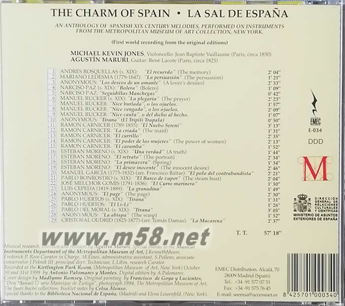 浪漫西班牙THE CHARM OF SPAIN 發燒大提琴 結他原音二重奏(m58.net) 浪漫西班牙THE CHARM OF SPAIN 發燒大提琴·結他原音二重奏 西班牙古典結他大師奧吉斯丁·馬魯尼聯同大提琴大師米高鐘斯,以紐約首都藝術館藏珍藏的大提琴和結他,演繹二十首十九世紀初西班牙著名的經典浪漫作品。奧吉斯西揮灑自如的指法,在 柔韌流暢的大提琴配合下,更見浪漫,錄音度極通透,仿如在您面前獻奏。