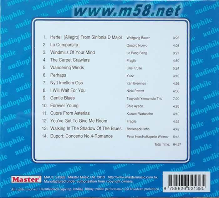 明達頂級發燒精選 MASTER SUPERIOR 2013(m58.net) 萬眾期待,一年一度發燒巨獻 ‧匯聚最頂級的人聲,最具實力的陣容 ‧頂級女聲、男聲、古典、爵士、爵士界巨星 ‧最高質立體感的錄音 ‧14首曲目,秒秒精彩 明達音樂一年一度發燒級巨獻,2013年度超級精選,匯聚最頂級的人聲,最具實力的陣容,包括: 日本爵士天后綾戶智惠 “Forever Young”,日本首席結他大師渡邊香津美 “Cuore From Asterias”,發燒女聲Nicki Parrott “The Last Time I Saw Paris”, 玫瑰仙子Kari Bremnes “Nytt Imellom Oss”,日本爵士界猛將山本剛 “Grntle Blues” ,暢銷二人組合Fragile “The Carpet Crawlers” 及 “You’ve Got To Give Me Room” ,美女小提琴手Line Kruse演奏 “Wandering Winds”, 傳奇藍調結他歌手Bottleneck John “Walking In The Shadow of The Blues”, 古典小號大師Wolfgang Bauer聯同樂團演奏Hertel的 “(Allegro) From Sinfonia D Major” ,爵士女歌手Yazz演繹名曲 “Perhaps” 等,令人回味!最具實力的陣容呈獻出一張非凡的發燒專輯,絕頂發燒級震撼感受。