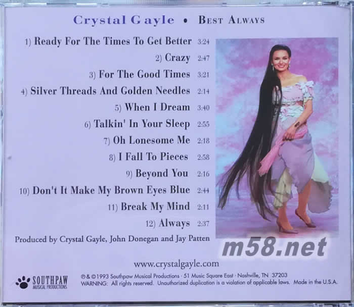 克莉絲朵蓋爾( Crystal Gayle)是以輕柔甜美的嗓音紅遍70年代至今的美國流行與鄉村樂壇的大姐大級別的歌手,因為她有一頭修長拖地的美麗金發,在國內常被人親切地稱為“長發妹”。 她演唱時全身心地投入,歌聲晶瑩,清純響亮,,感情豐富且富于磁性. Crystal Gayle不僅人長得很甜美,聲音也很有穿透力,她的歌曲中的中音區域,有種沉沉的共鳴。而《長發妹精選》又是CD圣經推薦的知名發燒天碟,因錄音水準甚佳,深受燒友喜愛。