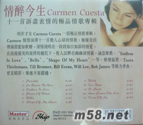 情醉今生PEACE OF MIND(m58.net) 頂級發燒天碟錄音 樂壇猛人群星拱照伴奏 優美浪漫舒懷的旋律 甜蜜如軟糖的女聲 十一首衷情盡訴的情歌 情醉今生 十一首訴盡衷情的極品情歌專輯 唱作才女carmen cuesta一張極品情歌專輯。carmen傾情演繹十一首動人主扉的情歌,她優美的聲線甜蜜如軟糖,深情淺唱出一段段如泣如訴的情愛,在浪漫優美的旋律的襯托下,使人沉醉在幽幽深情里,誠意推薦:'Endless is 'love.'bells','shape of my heart'...等樂壇猛將:toots thielemans,till bronner,till bronner,bill evens,will lee,bob james等傾力伴奏,更見精彩,樂迷不容錯過.