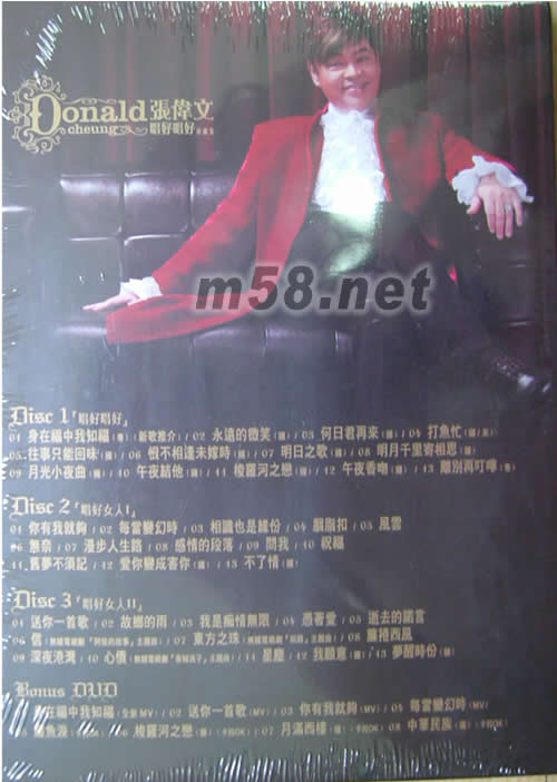 Disc 1 [唱好唱好] 1.身在福中我知福(粵)(新歌推介) 2.永遠(yuǎn)的微笑(國(guó)) 3.何日君再來(lái)(國(guó)) 4.打魚忙(國(guó)/英) 5.往事只能回味(國(guó)) 6.恨不相逢未嫁時(shí)(國(guó)) 7.明日之歌(國(guó)) 8.明月千里寄相思(國(guó)) 9.月光小夜曲(國(guó)) 10.午夜吉他(國(guó)) 11.梭羅河之戀(國(guó)) 12.午夜香吻(國(guó)) 13.離別再叮嚀(粵) Disc 2 [唱好女人Ⅰ] 1.你有我就夠 2.每當(dāng)變幻時(shí) 3.相識(shí)也是緣份 4.胭脂扣 5.風(fēng)云 6.無(wú)奈 7.漫步人生路 8.感情的段落 9.問(wèn)我 10.祝福 11.舊夢(mèng)不須記 12.愛你變成害你(國(guó)) 13.不了情(國(guó)) Disc 3 [唱好女人Ⅱ] 1.送你一首歌 2.故鄉(xiāng)的雨 3.我是癡情無(wú)限 4.憑著愛 5.逝去的諾言 6.信(無(wú)線電視劇[阿信的故事]主題曲) 7.東方之珠(無(wú)線電視劇[前路]主題曲) 8.簾卷西風(fēng) 9.深夜港灣 10.心債(無(wú)線電視劇[香城浪子]主題曲) 11.星塵 12.我愿意(國(guó)) 13.夢(mèng)醒時(shí)分(國(guó)) Bonus DVD 1.身在福中我知福(全新MV) 2.送你一首歌(MV) 3.你有我就夠(MV) 4.每當(dāng)變幻時(shí)(MV) 5.鱷魚淚(卡拉OK) 6.梭羅河之戀(國(guó))(卡拉OK) 7.月滿西樓(國(guó))(卡拉OK) 08.中華民族(國(guó))(卡拉OK)