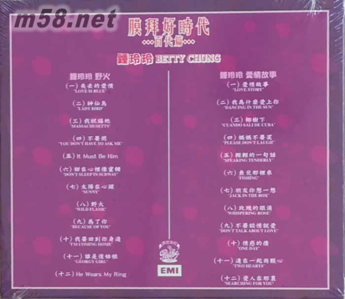 1. 張露( A)- 膜拜好時代 disc1.張露 An Evening with Chang Loo / disc2.張露 蘋果花 (2in1CDset) 8888603 2. 張露( A)- 張露之歌(花嫁) 扇舞 [膜拜好時代之百代篇] 8860880 3. 姚莉( A)- 膜拜好時代 雪人不見了 / 姚莉之歌.歌迷小姐 (2in1CDset) 8888318 4. 姚莉( A)- 那個不關心 琵琶記 ( 膜拜好時代 2IN1: 百代篇 ) 8888841 5. 潘秀瓊( A)- 潘秀瓊 Poon Sow Keng/ 柔情萬縷 [膜拜好時代之百代篇] 8888606 6. 潘迪華( A)- 給我一杯愛的咖啡 / 男歡女愛 (2in1CDset) 膜拜好時代 8888333 7. 劉韻( A)- 膜拜好時代 穿短裙的小姐 / 知道不知道 (2in1CDset) 8888330 8. 靜婷( A)- 江山美人 / 傾國傾城 [膜拜好時代之百代篇] 8888748 9. 靜婷( A)- 膜拜好時代 電影歌選 / 癡癡地等 (2in1CDset) 8888327 10. 葛蘭( A)- 野玫瑰之戀 教我如何不想她 ( 膜拜好時代 2IN1: 百代篇 ) 8888899 11. 葛蘭( A)- 膜拜好時代 星星月亮太陽 (2in1CDset) 8888324 12. 方逸華( A)- 膜拜好時代 disc1.方逸華 中西名曲 / disc2.方逸華 與西班牙旋律 (2in1CDset) 8888609 13. 鄧麗君( A)- 鄧麗君/ 群星 歌迷小姐 [膜拜好時代之百代篇] 8860888 14. 陳芬蘭( A)- 親愛的母親 / 陳芬蘭與流行歌曲 [膜拜好時代之百代篇] 8860885 15. EMI百代群星( A)- 鐘玲玲野火 / 愛情故事 [膜拜好時代之百代篇] 8888720 16. EMI百代群星( A)- 葉楓 桃李爭春 / 魂牽舊夢 [膜拜好時代之百代篇] 8888612 17. EMI百代群星( A)- 膜拜好時代 disc1.崔萍 心聲弦韻 / disc2.崔萍 雨夜的街燈 (2in1CDset) 8888637 18. EMI百代群星( A)- 黃昏放牛 一片青青的草地 舒云歌集 [膜拜好時代之百代篇] 8861007 19. EMI百代群星( A)- 龔秋霞/ 白虹 秋水伊人/ 醉人的口紅 [膜拜好時代之百代篇] 8860891 20. EMI百代群星( A)- 白光 / 梁萍 BAI KWONG / LIANG PING 秋夜 / 昭君怨 ( 膜拜好時代 2IN1: 百代篇 ) 8888785