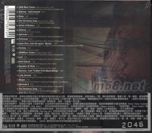[2046]是什么?是一組數字、一個年代、一間房號,還是一班列車?是一個男人與五個女人癡纏、是時空交錯的愛嗔怨恨,也是冷熱難解的愛情囈語。電影集合梁朝偉、張曼玉、木村拓哉、鞏利、王菲、劉嘉玲、章子怡、張震中港臺日八大巨星合力演出;原聲帶也同樣集合日、德、美、波蘭、挪威、西班牙各國配樂大師與傳奇歌手精銳盡出,[2046]絕對是全球影迷爭相收藏的經典大碟。