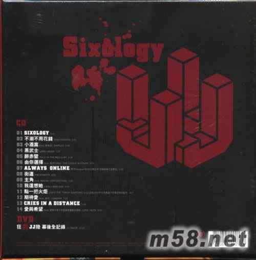 CD 01. Sixology 02. 不潮不用花錢 03. 小酒窩 (feat.蔡卓妍) 04. 黑武士 05. 醉赤壁 06. 由你選擇 (feat.農(nóng)夫FAMA) 07. Always Online 08. 街道 09. 主角 (feat.MACHI) 10. 我還想她 11. 點(diǎn)一把火炬 12. 期待愛 (feat.金莎) 13. Cries In A Distance 14. 愛與希望 (feat.重慶市青少年宮銀杏童聲合唱團(tuán)) DVD 狂奔JJ陸 幕后全記錄