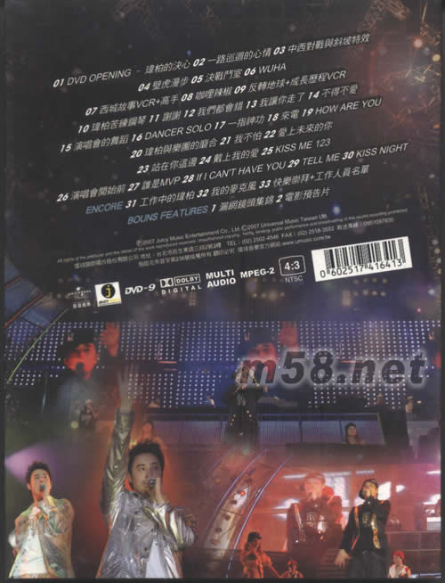 01. DVD OPENING - 瑋柏的決心 02. 一路巡回的心情 03. 中西對戰(zhàn)與斜坡特效 04. 壁虎漫步 05. 決戰(zhàn)斗室 06. WU HA 07. 西城故事VCR+高手 08. 咖哩辣椒 09. 反轉(zhuǎn)地球+成長歷程VCR 10. 瑋柏苦練鋼琴 11. 謝謝 12. 我們都會錯 13. 我讓你走了 14. 不得不愛 15. 演唱會的舞蹈 16. DANCER SOLO 17. 一指神功 18. 來電 19. HOW ARE YOU 20. 瑋柏與樂團(tuán)的磨合 21. 我不怕 22. 愛上未來的你 23. 站在你這邊 24. 戴上我的愛 25. KISS ME 26. 演唱會開始前 27. 誰是MVP 28. if i CAN'T HAVE YOU 29. TELL ME 30. KISS NIGHT ENCORE 31. 工作中的瑋柏 32. 我的麥克風(fēng) 33. 快樂崇拜+工作人員名單 BOUNS FEATUTRES 01. 漏網(wǎng)鏡頭集錦 02. 電影預(yù)告片