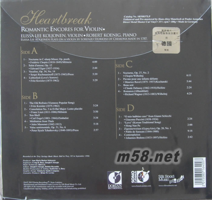 心碎 浪漫小提琴之聲Heartbreak ROMANTIC ENCORES FOR VIOLIN 雙黑膠(m58.net) Elissa Lee Koljonen (violin)、 Robert Koenig (piano) 「心碎」浪漫小提琴之聲(「Heartbreak」Romantic Encores For Violin)—叱咤發燒界及古典樂壇接近20年,被推崇為測試高級音響必備的鑑聽專輯之一,入選<音響論壇>總編「劉漢盛CD榜單」之一,專業高級音樂界一致認同。1999年由美國古典品牌<多里亞(Dorian)>為全美當時得令、擁有高崇的音樂知識、才藝非凡、有「小提琴美女」之稱的女小提琴演奏家伊莉莎.李.柯莉恩琳(Elissa Lee Koljonen)所灌錄的首張個人專輯。她曾於“卡爾.費雪小提琴大賽(Carl Flesch International)”獲得銀獎、“謝霖基金會(Henryk Szeryng Foundation)”獲得小提琴演奏大獎等,《巴爾的摩太陽報(The Baltimore Sun)》以「她是近年來我聽過最具天份的小提琴家,未來成就無可限量…」來給予好評,絕對是90年代未最耀眼的小提琴之星。而柯莉恩琳於「心碎」浪漫小提琴之聲中以一把於1787年由意大利格里製琴大史托里昂尼(Lorenzo Storioni)所製、價值連城的名琴演奏,配合鋼琴家羅勃.科寧(Robert Koenig)的伴奏,完美示范了以下的古典美樂作品選: