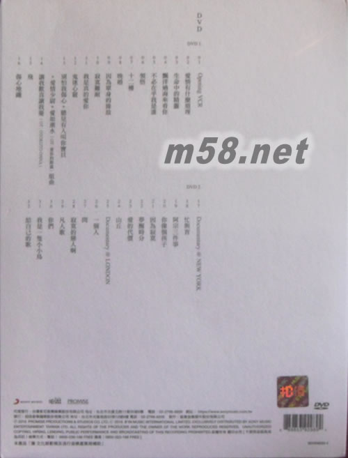 DVD1 曲目 01. Opening VCR(Taipei 12.27 opening) 02. 愛情有什么道理 03. 生命中的精靈 04. 飄洋過海來看你 05. 不必在乎我是誰 06. 領悟 07. 十二樓 08. 晚婚 09. 因為單身的緣故 10. 寂寞難耐 11. 我是真的愛你 12. 鬼迷心竅 13. 別怕我傷心+聽見有人叫你寶貝+愛情少尉愛如潮水(OT:愛你的余溫) 組曲 14. 讓我歡喜讓我憂(OT :OTOKOTO ONNA) 15. 飛 16. 傷心地鐵 DVD2曲目 17. Documentary @ NEW YORK 18. 忙與盲 19. 阿宗三件事 20. 你像個孩子 21. 因為寂寞 22. 夢醒時分 23. 愛的代價 24. 山丘 25. Documentary @ LONDON 26. 一個人 27. 問 28. 寂寞的戀人 29. 凡人歌 30. 你們 31. 我是一只小小鳥 32. 給自己的歌 系統規格:DVD9 音效選擇:PCM / DTS 5.1 / Dolby Digital 5.1 螢幕比例:16:9 時間長度:01:23:01 (Disc 1) / 01:20:48 (Disc 2) 區碼:全區 字幕:中文繁簡體