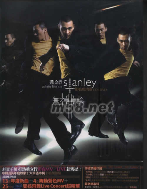 無神論(影音慶功版)(m58.net) 耗資千萬打造黃立行 影音MV/LIVE 新震撼 中時2006年度娛樂十大華語專輯 影音加值版 超值慶功收錄 13首年度新曲+4支舞動聲色MV+25min intel雙核飛舞Live Concert超精華 突破禁播珍藏 [無神論]MV 演技派美女林熙蕾跨刀激情大膽演出 [打分數(shù)]看雙面關穎激發(fā)舞神STANLEY大展舞功 [禮物]使壞男人也懂得愛!STANLEY深情演出絕美的愛戀情懷 [未來]未來高科技概念貫穿,展現(xiàn)STANLEY 時尚前沖新浪潮 超激再收錄 黃立行+蔡依林最HOT時尚組合現(xiàn)場演出SM版[乖乖牌]
