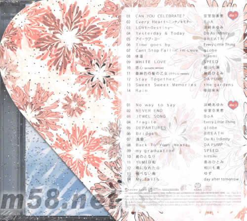 曲目請點看專輯背面大圖 DISC 1 1、CAN YOU CELEBRATE/安室奈美惠 2、EVERY HEART/BOA 3、LOVE DESTINY/濱崎步 4、YESTERDAY/TODAY/DO ADS INFINITY 5、 6、TIME GOES BY /EVERY LITTLE THING 7、CAN‘T STOP FALLIN IN LOVE /GLOBE 8、體溫/HOTOMI 9、WHITE LOVE /SPEED 10、戀心/相川七瀨 11、 12、STAY TOGETHER/DA PUMP 13、SWEET SWEET MEMORIES/THE GARDENS 14、RAIN/侍田未來 DISC 2 1、NO WAY TO SAY /濱崎步 2、NEVER END/安室奈美惠 3、JEWEL SONG/BOA 4、FRAGILE/EVERY LITTLE THING 5、DEPARTURES/GLOBE 6、BRIDGE/BREATH 7、遠雷/DO AS INFINITY 8、BACK TO YOUR HEART/DA PUMP 9、MY GRADUATION/SPEED 10、 12、 13、 14、MY FAITH /DAY AFTER TOMORROW