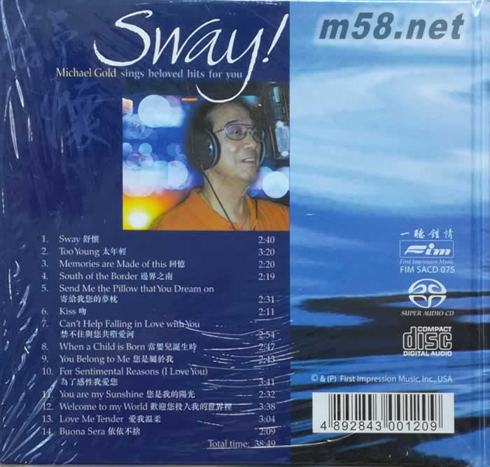舒懷SWAY! SACD(m58.net) 你認(rèn)為你以前已經(jīng)聽(tīng)到『麥克』的聲音,答案是肯定的,不是因?yàn)樗穆曇艉统璧娘L(fēng)格如此為你所熟知,實(shí)際上,這是他在FIM的第2 張專(zhuān)輯,他的第一個(gè)是『Christmas Party』。那些情歌對(duì)於生在50年代的青少年來(lái)說(shuō),將引起愉快的記憶。對(duì)第一次經(jīng)歷他們的那些人來(lái)說(shuō),這些歌將更進(jìn)一步鼓舞他們對(duì)音樂(lè)的愛(ài),和人生的期待。經(jīng)歷漫長(zhǎng)用心的錄音過(guò)程中,其目的就是確保Michael那慵懶,帶有磁性的聲音,是一張不可多得的男聲示范碟。